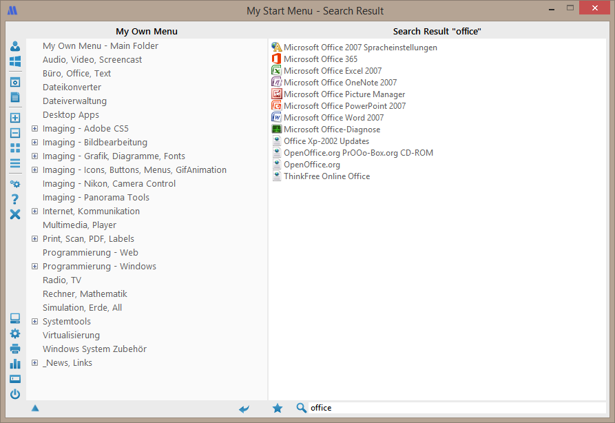 My Start Menu is the alternative start menu for Microsoft Windows™ enabling you instant access to applications, recently opened documents, folders, drives and websites. The user interface is similar to the familiar Windows Explorer. Once an object has been started the opened menu folders remain open. New programs and other objects can simply be added by drag & drop or via the shortcut wizard. Various system functions such as Windows Explorer and Control Panel can be opened directly via corresponding icons. In addition, a search function and a bookmark list as well as a list of recently launched programs and of recently opened documents enable an even faster access to the programs and documents. With the easy user interface and the permanent presence of the program window of My Start Menu the operation of your PC is much easier, faster and can be much better customized to your needs. Learn in our blog post how to increase your productiviy with My Start Menu.